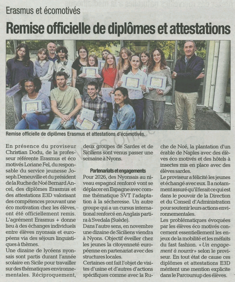 La remise des diplômes et attestations relayée par la presse locale est encore une occasion de mettre à l'honneur nos élèves engagés et nos partenaires Joseph de l'Espace jeunesse et Bernard de la Ruche de Noe.